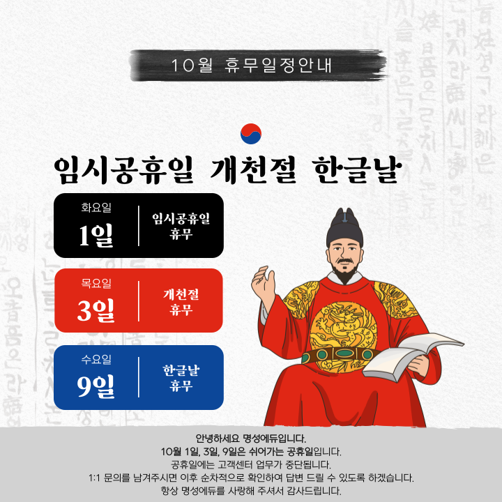 2024년 10월 1일(화) 임시공휴일과 3일(목) 개천절, 9일(목) 한글날은 은 휴무로 고객센터 업무가 중단됩니다.