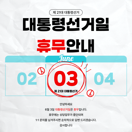 6월 3일 대통령선거일은 휴무입니다.