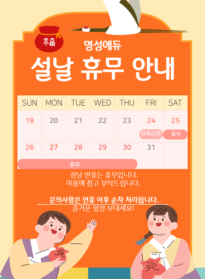 2025년 1월 24일(금) ~ 1월 30일(목) 설날연휴는 휴무입니다.